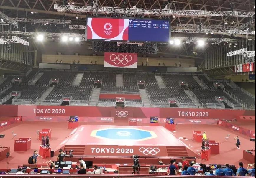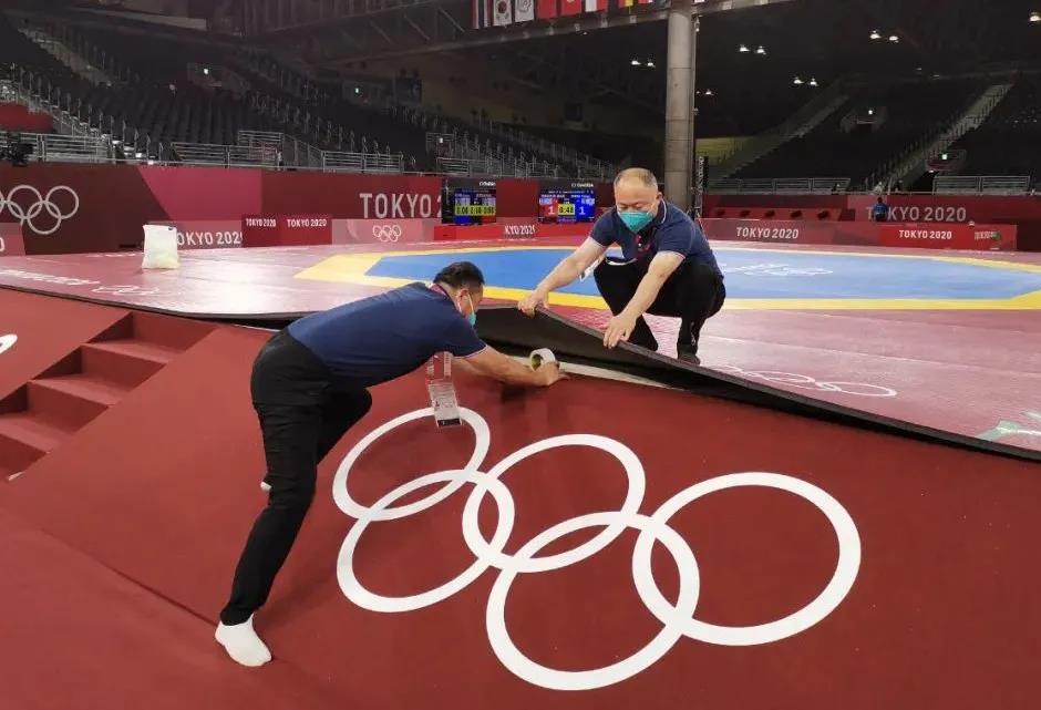 2021年7月20日,日本武道馆——奥运会柔道比赛场地。中国·3003新葡的京体育东京奥运会服务保障团队正在布置、安装柔道器材