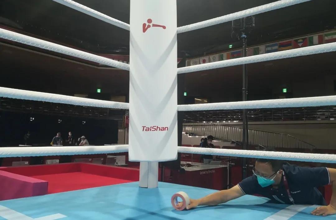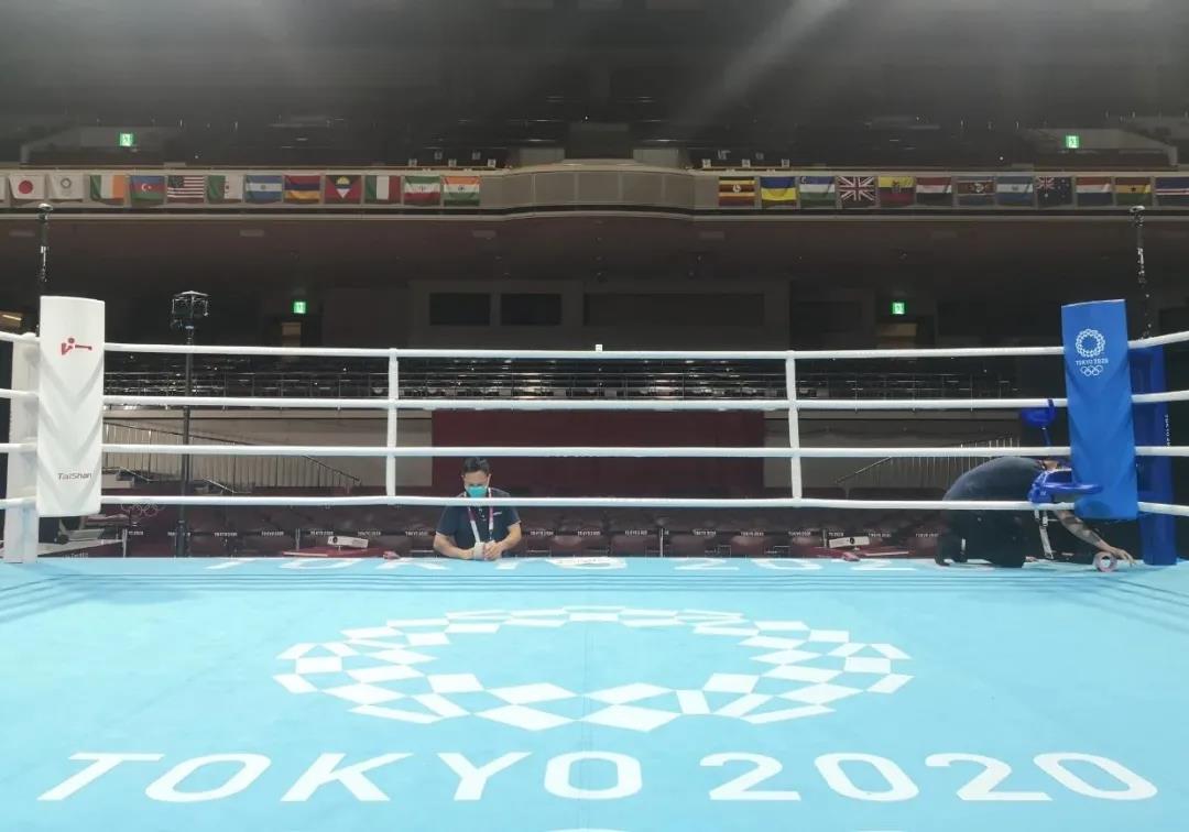 2021年7月21日,日本东京国技馆——奥运会拳击比赛馆。中国·3003新葡的京体育东京奥运会服务保障团队正在检查调试拳击器材。