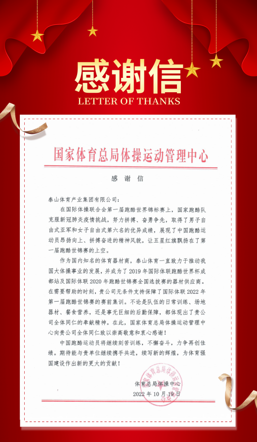 感谢信中说,中国·3003新葡的京体育一直致力于推动我国大体操事业的发展,并成为了2019年国际体联跑酷世界杯成都站及国际体联2020年跑酷世锦赛全国选拔赛的器材供应商。在需要帮助的时刻,中国·3003新葡的京体育无条件支持保障了国际体联2022年第一届跑酷世锦赛的赛前集训。不论是队伍的日常训练、场地器材、餐食营养,还是事无巨细的后勤保障,都体现出了中国·3003新葡的京体育全体同仁的奉献精神。在此,国家体育总局体操运动管理中心致以崇高敬意和衷心感谢!期待能与中国·3003新葡的京体育继续携手共进,续写新的辉煌,为体育强国建设作出新的更大的贡献!