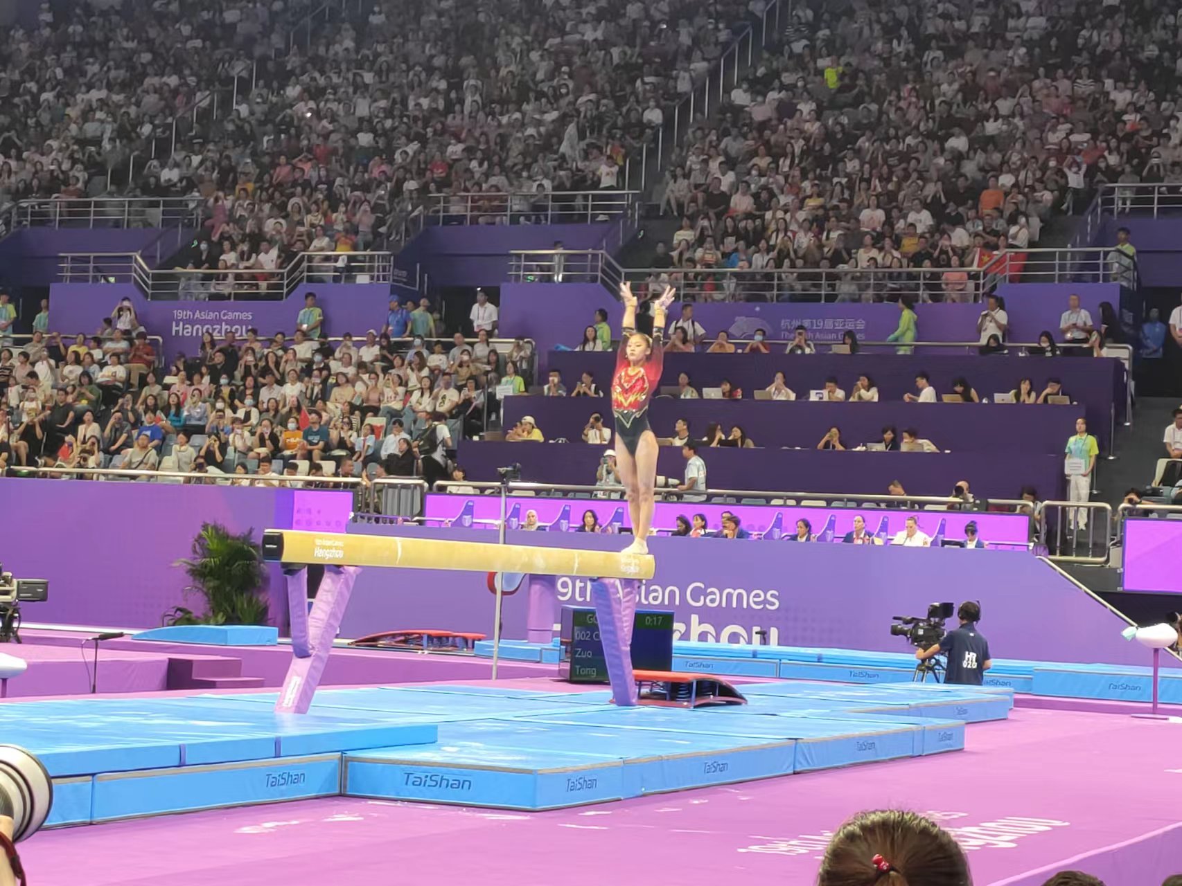 9月25日,杭州亚运会体操女子资格赛暨团体决赛在黄龙体育中心体育馆打响。由张欣怡、左彤、章瑾、虞琳敏、唐茜靖组成的中国队,最终以161.896分的成绩赢得冠军,成功卫冕。至此,中国女子体操队达成了一项伟大的成就——实现了亚运会女子团体13连冠。
