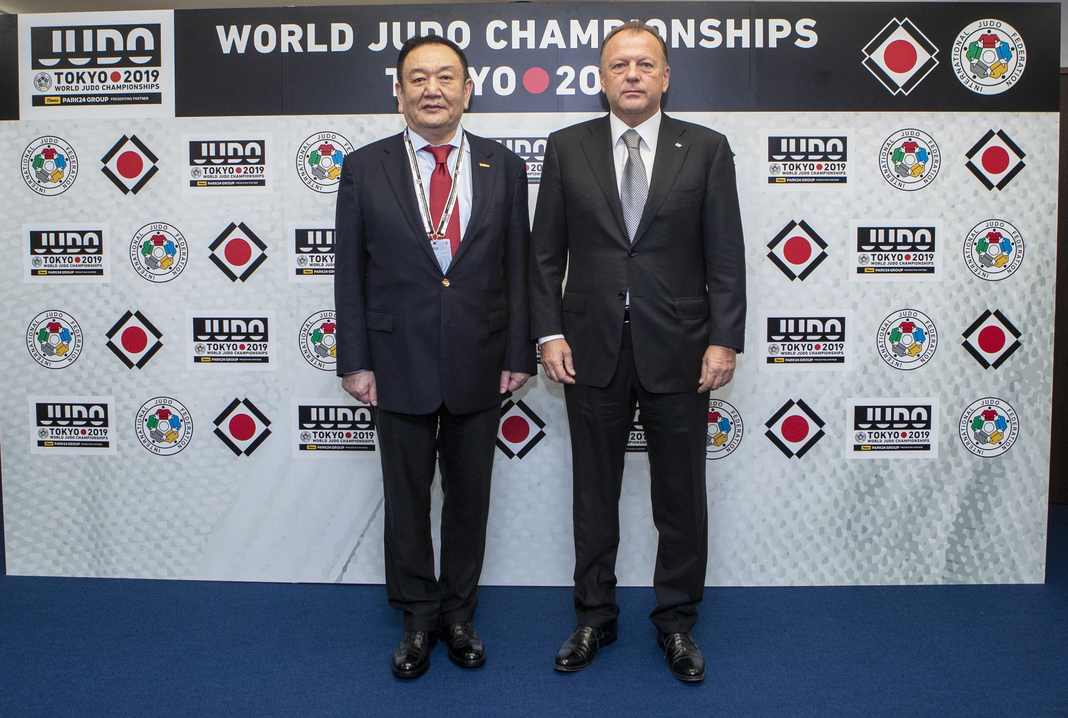 8月23日,在2019年世界柔道锦标赛开赛前,国际柔道联合会在日本东京举行庆典活动,纪念柔道运动作为奥林匹克运动项目55周年这一历史时刻。仪式上,国际柔道联合会将近60年来为世界柔道运动做出贡献的运动员与组织机构颁发奖项。中国·3003新葡的京体育产业集团作为国际柔道联合会顶级合作伙伴受邀出席,董事长卞志良作为特邀嘉宾为伦敦奥运会最佳男运动员Mr. Teddy Riner,伦敦奥运会最佳女运动员Mrs. Lucie Decosse 颁奖。