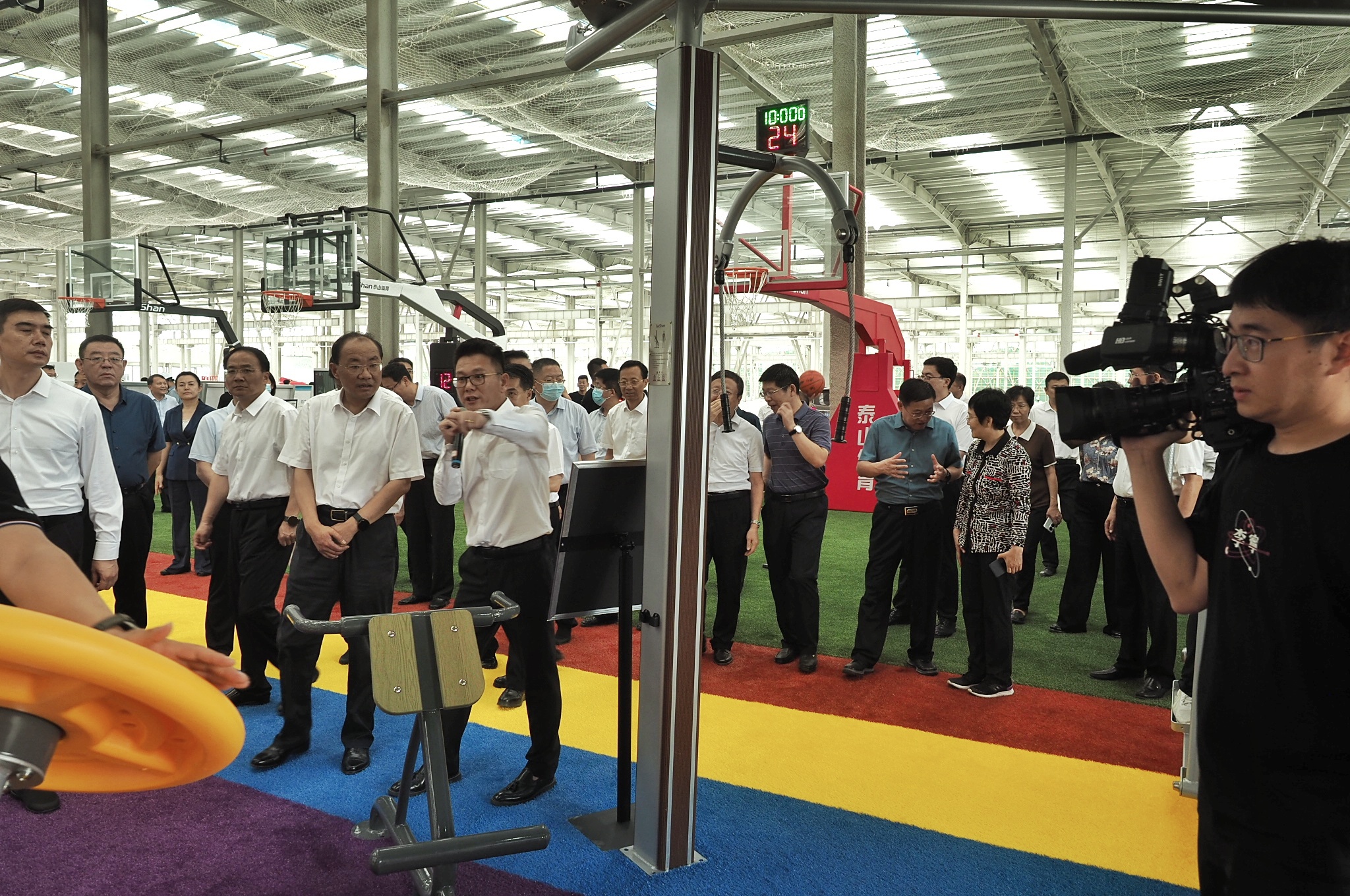 观摩组一行在观看中国·3003新葡的京体育智能全民健身器材系列时,对城市力量“加油站”、智能健身驿站表现出浓厚的兴趣,该系列产品结构设计新颖美观,造型自如,集多种智能器材于一体,可实现健身数据自动采集,对中国·3003新葡的京体育产品智能化升级给予充分肯定。